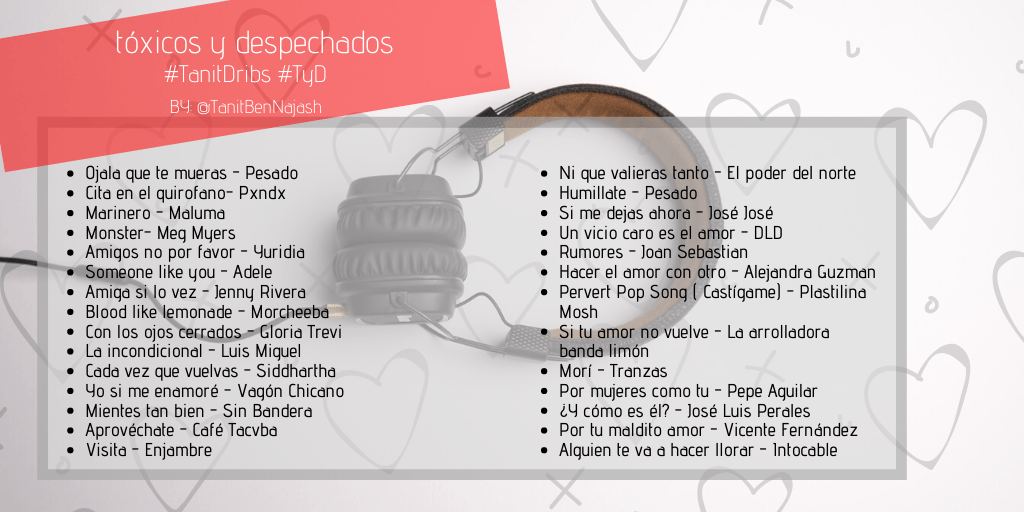 Y ya esta son todas las bases. La playlist por si quieren darle un vistazo a los títulos antes de escucharlos es la siguiente y se encuentra en texto plano en este enlace: «Tóxicos y despechechados | Playlist Texto Plano» o en Youtube Music, y en Spotify gracias a Lau, una de las chicas de mi canal que se ganaron acceso anticipado a la tabla por hacerme un doodle de Amanda Miguel emo style.